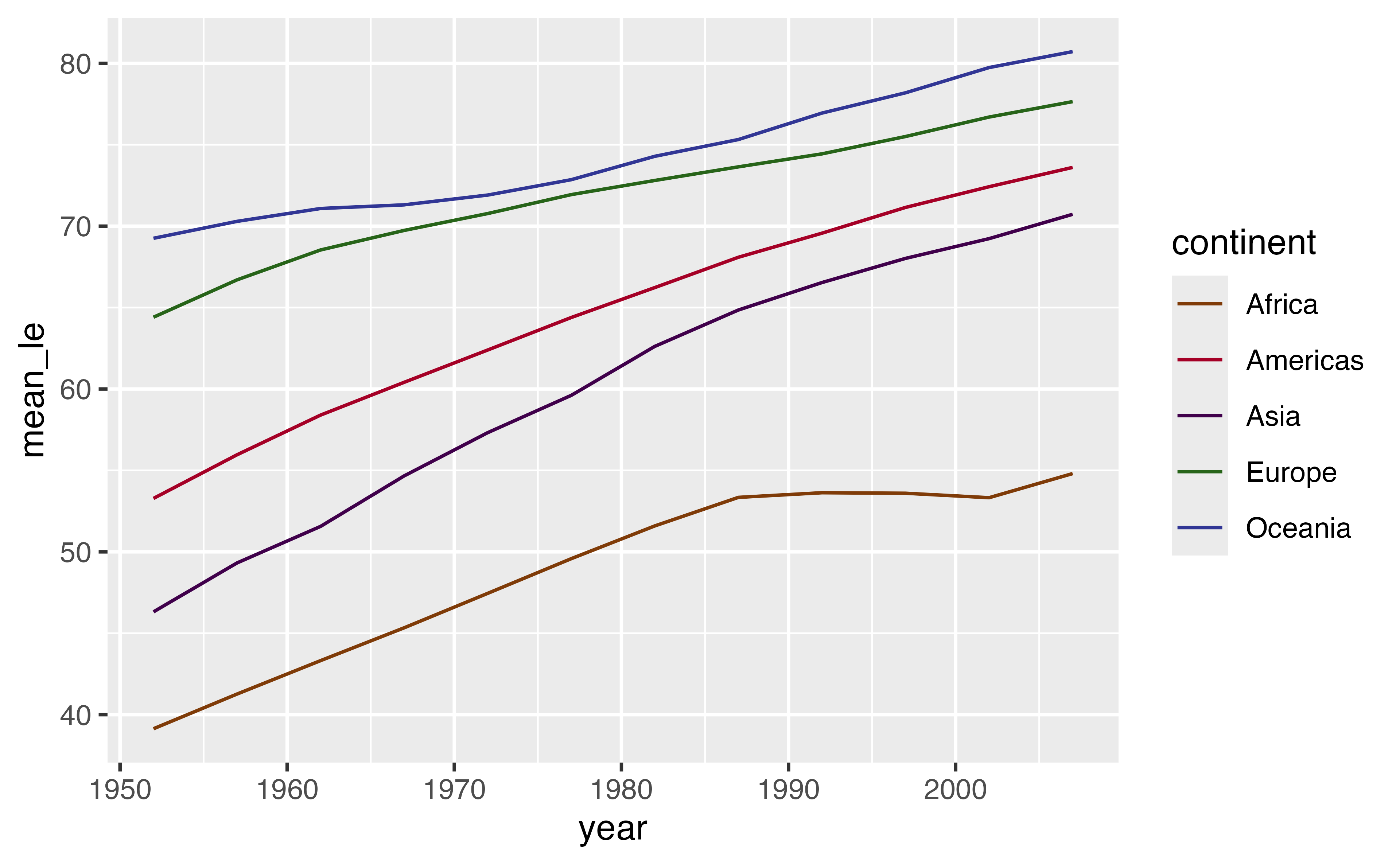 mean_le. Plot the life expectancy over time (no need to change the plot code).mean_le. Plot the life expectancy over time (no need to change the plot code).left_join(), right_join(), full_join(), or inner_join() to join datasetssemi_join() or anti_join() to filter datasets against each other