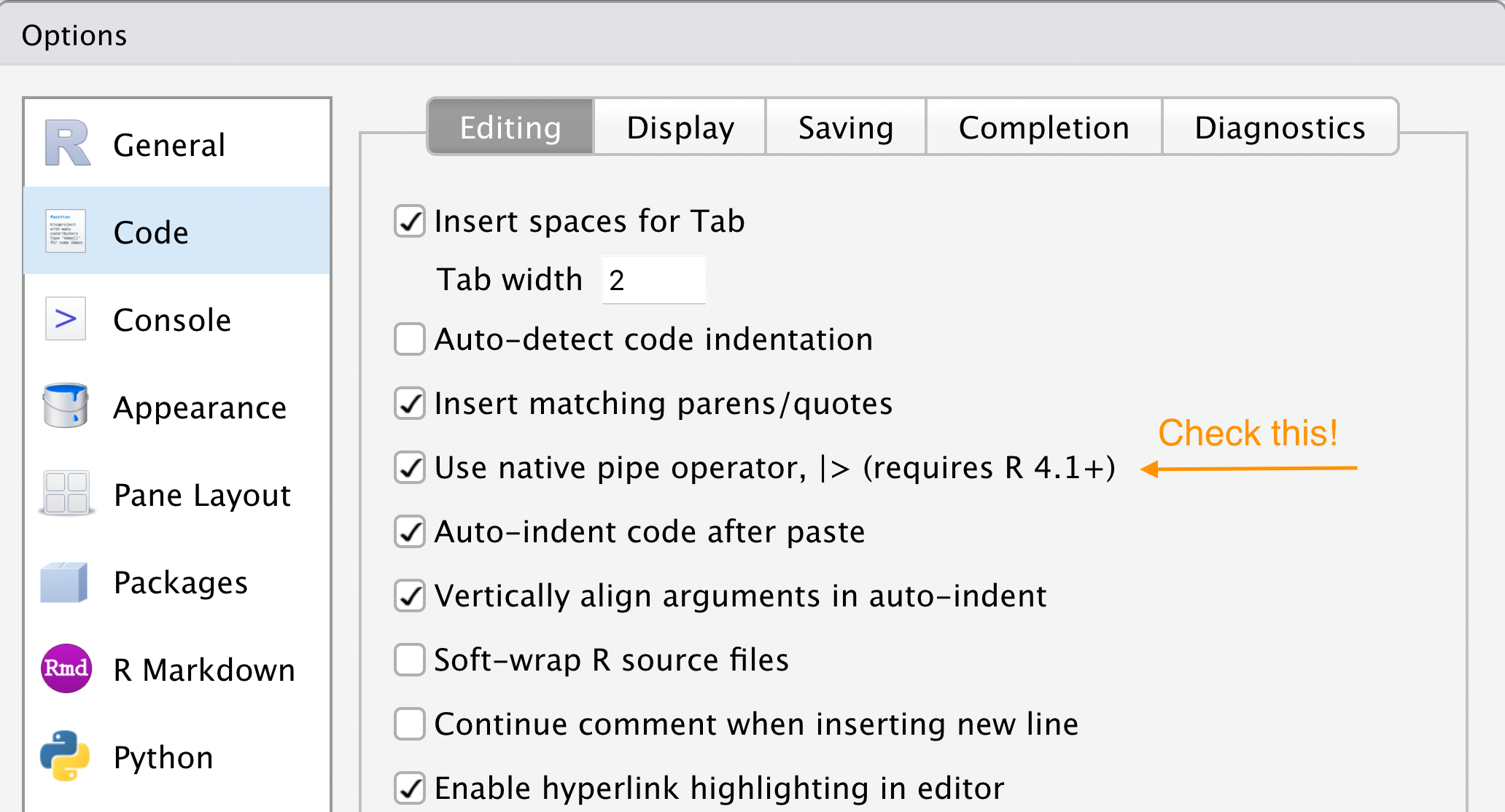 Tools > Global Options > Code