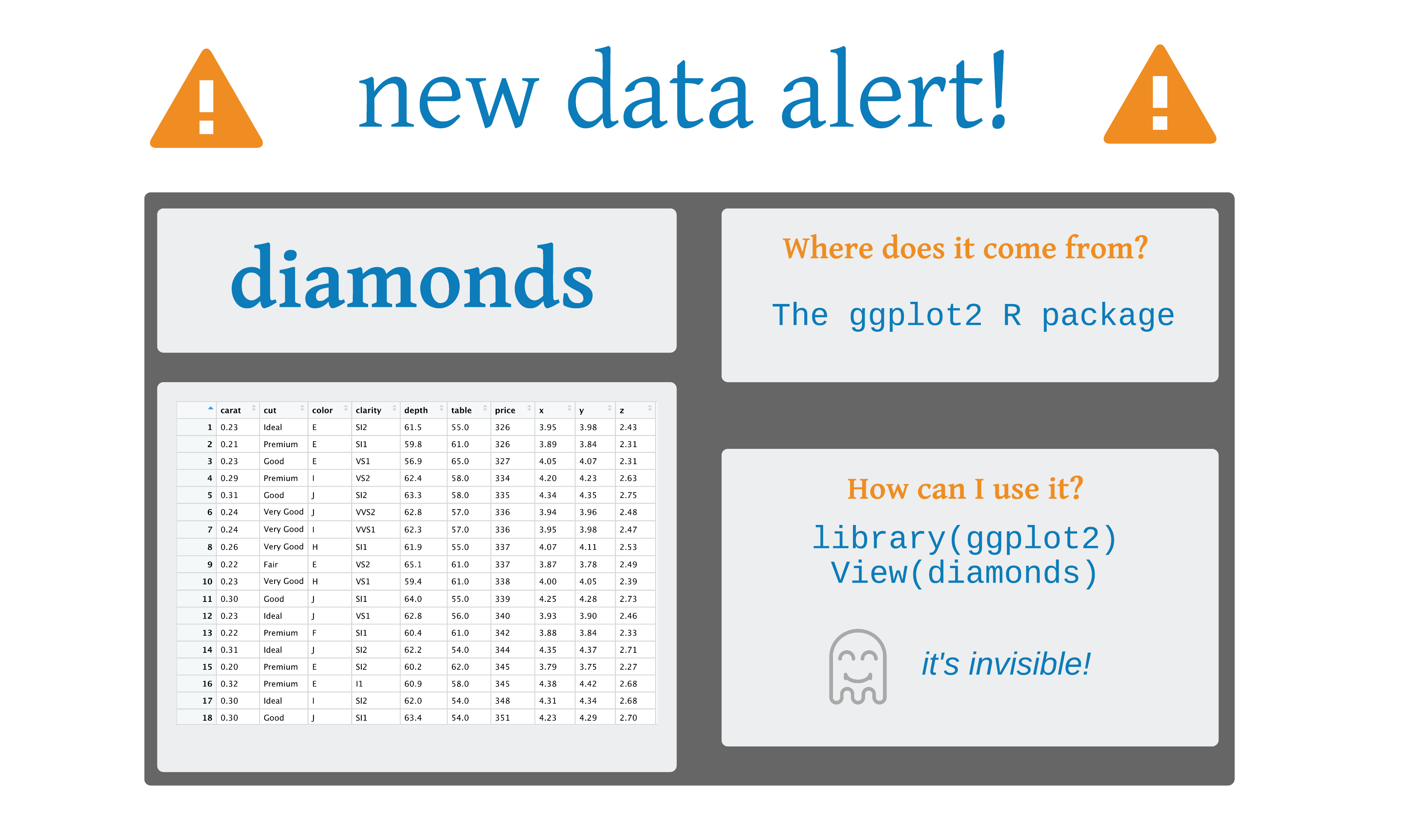 dplyrselect()filter()mutate()arrange() = Sort the data setsummarize()group_by()arrange()arrange()# A tibble: 53,940 × 10