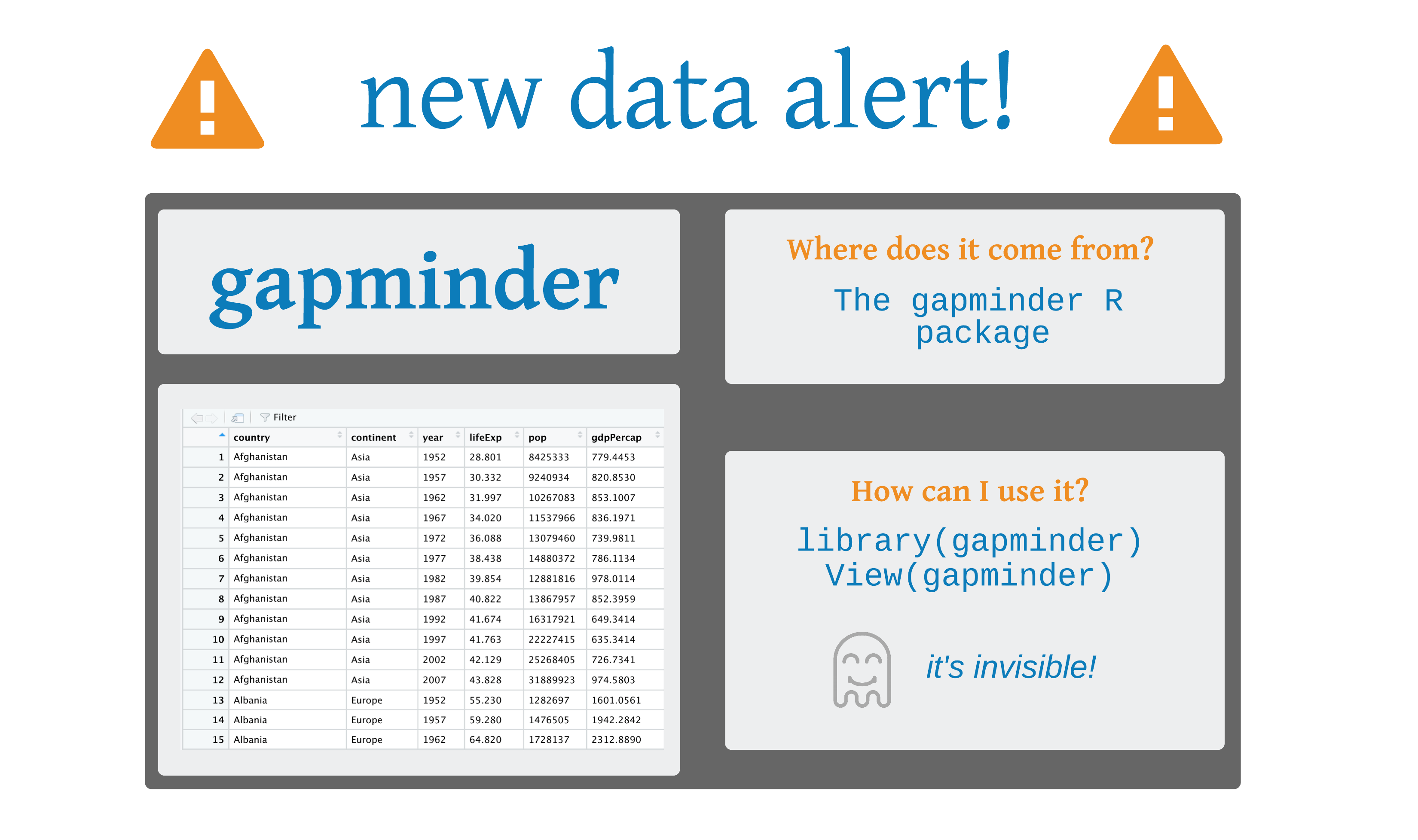 %>% a lot. This is the old pipe prior to when R had a built-in one. Either pipe is fine, but we’ll use the so-called native pipe |>|> to write a sequence of functions that:country, year and lifeExp columnsgapminder |>