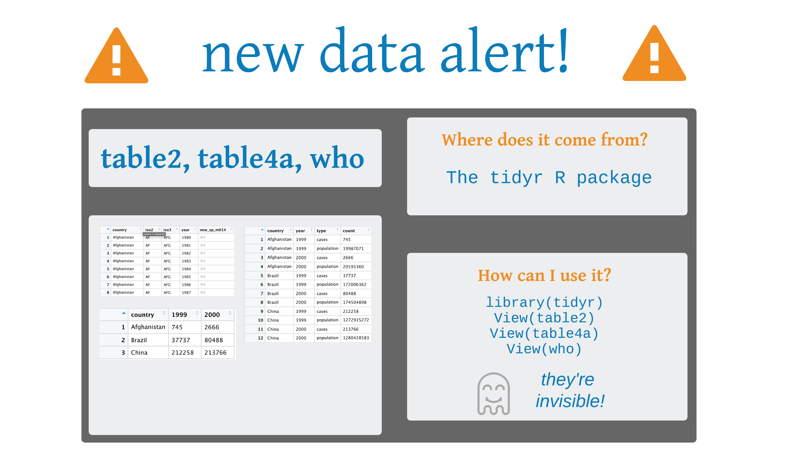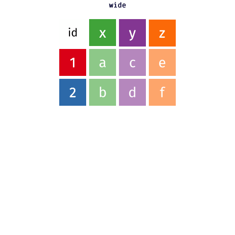 pivot_longer() to reorganize table4a into three columns: country, year, and cases.pivot_wider()Animation by Mara Averick