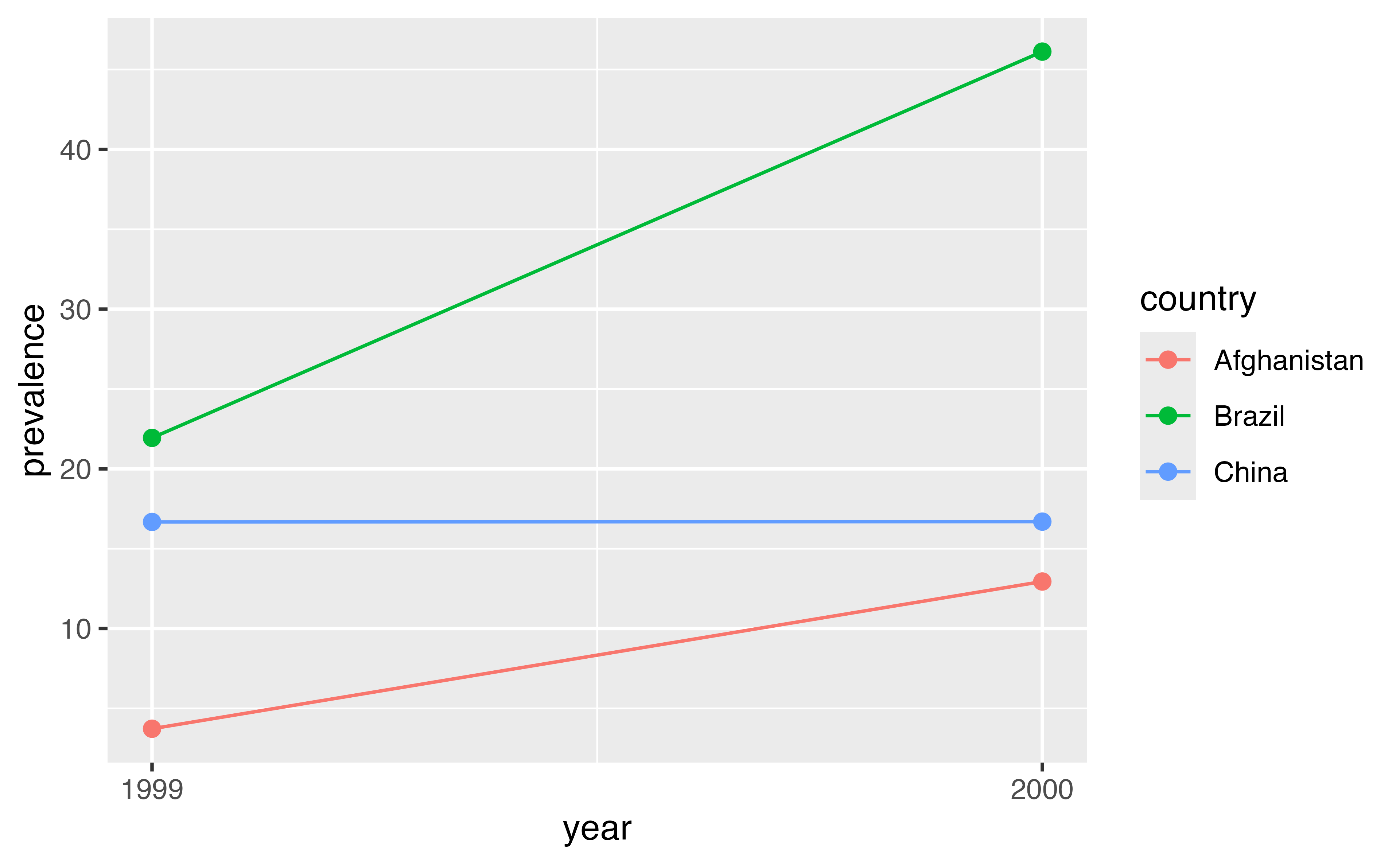 pivot_wider() to reorganize table2 into four columns: country, year, cases, and population.prevalence that divides cases by population multiplied by 100000.year on the x axis and prevalence on the y axis. Set the color aesthetic (aes()) to country. Use size = 2 for the points. Add a line geom.table2 |>