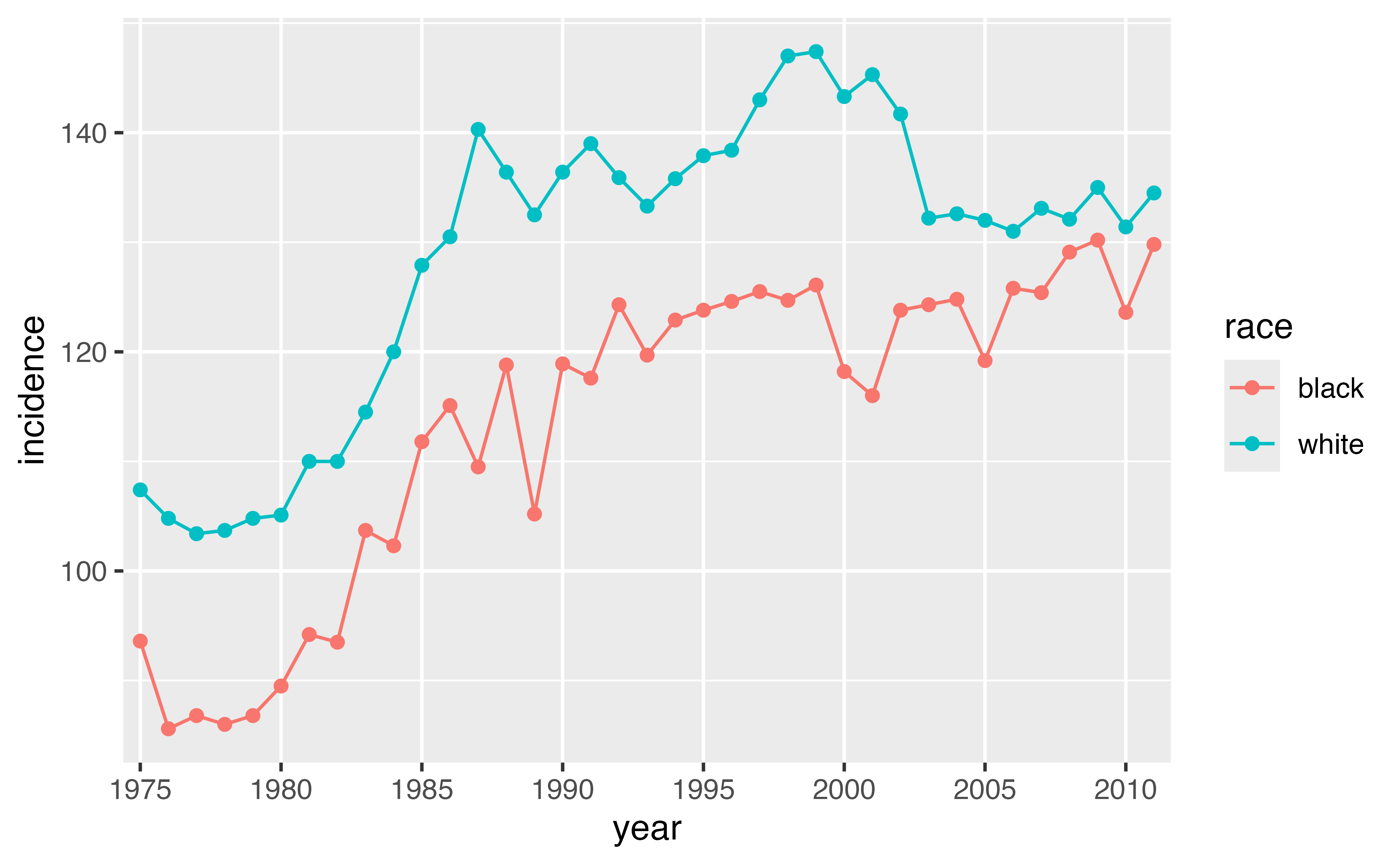year and incidencerace. Remember that each data set corresponds to a single race.bind_rows() from the dplyr package. Either save it as a new object or pipe the result directly into the ggplot2 code.year on the x-axis, incidence on the y-axis, and race as the color aesthetic.# A tibble: 21,245 × 3