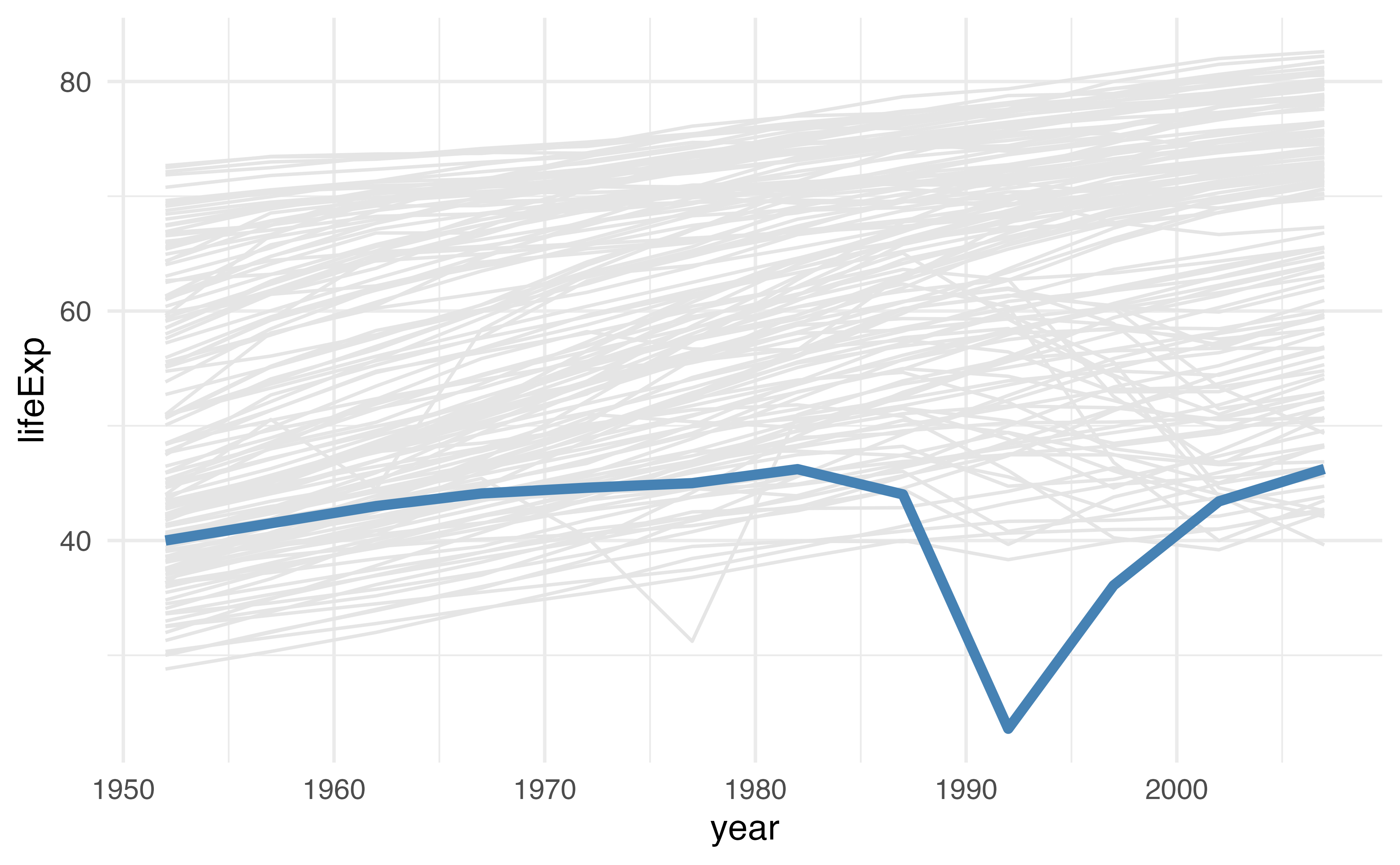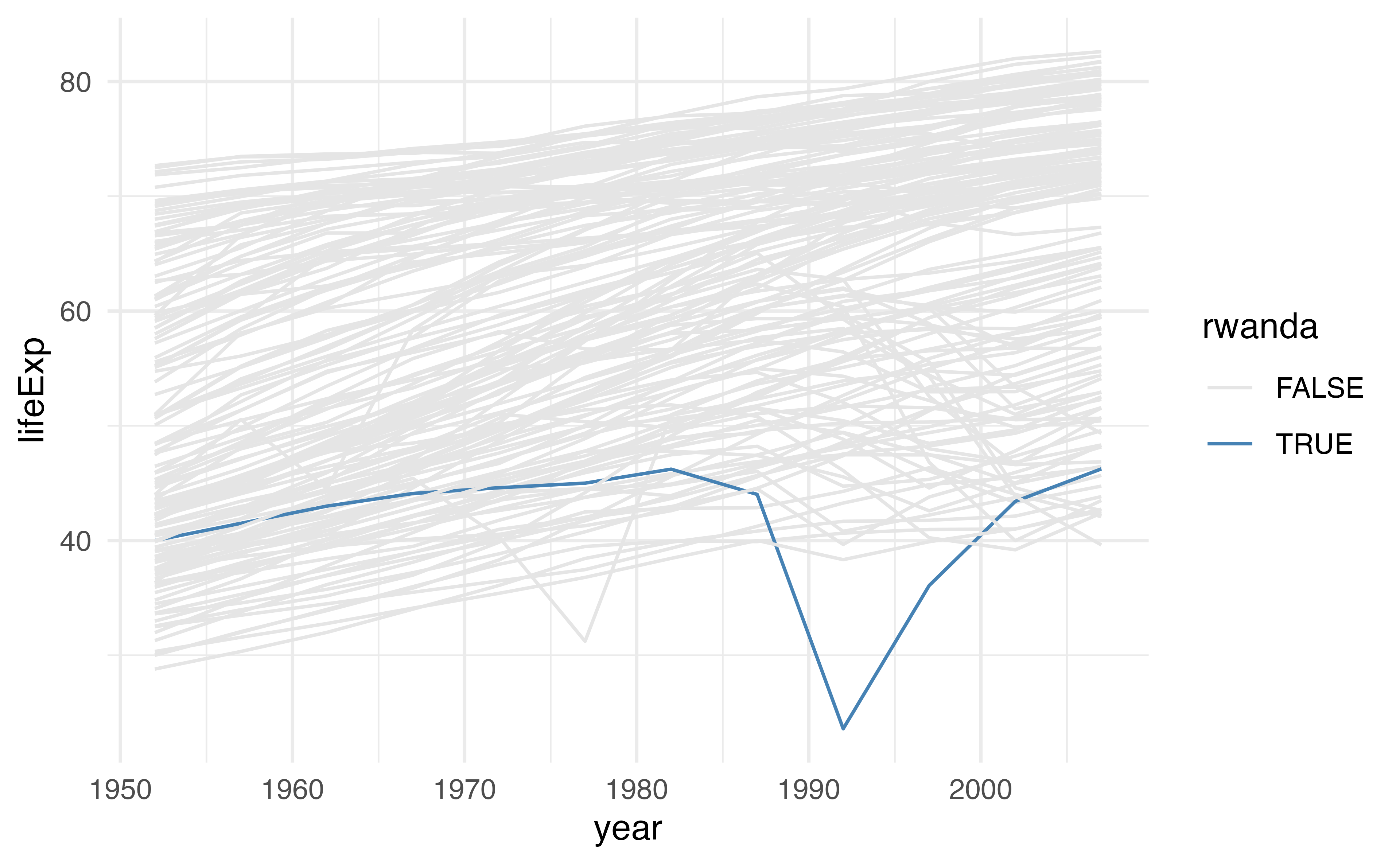 ggplot(aes(year, lifeExp, color = rwanda, group = country)) +