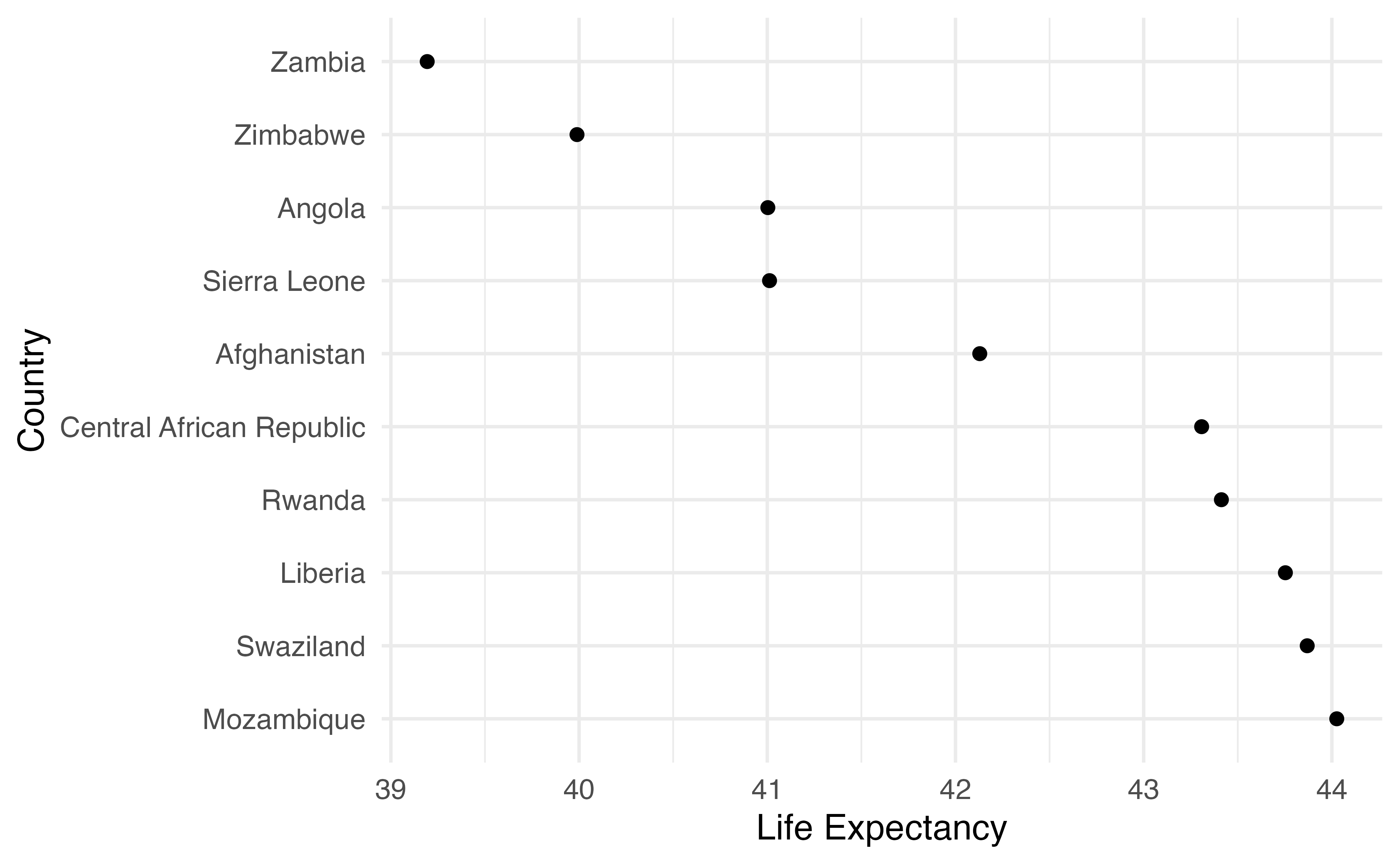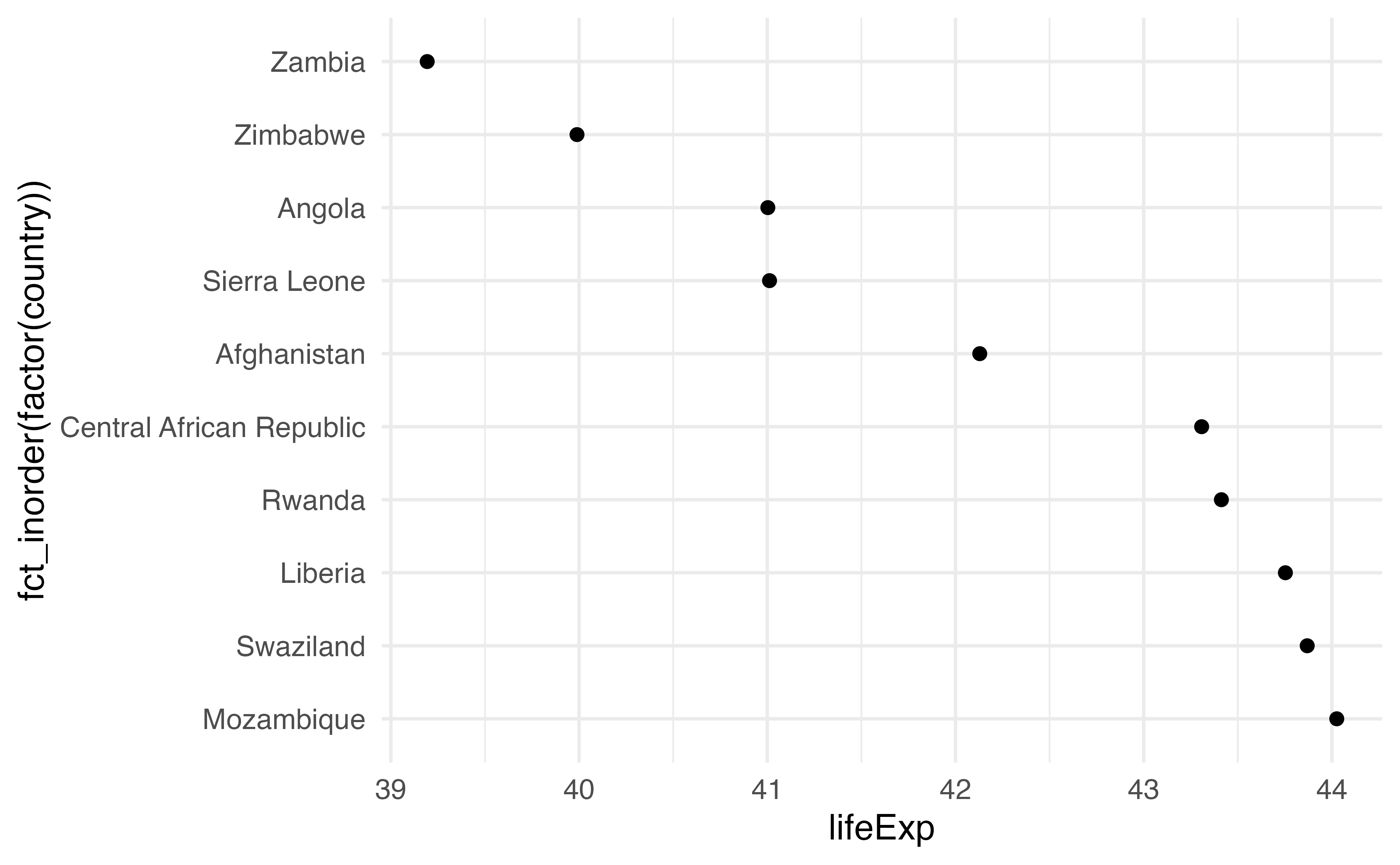 year using the value of .year (notice the period before hand!). You do NOT need curly-curly for this. (Why is that?)variable for x. For y, we’ll use country, but to keep it in the order we arranged it by, we’ll turn it into a factor. Wrap the the factor() call with fct_inorder(). Check the help page if you want to know more about what this is doing.